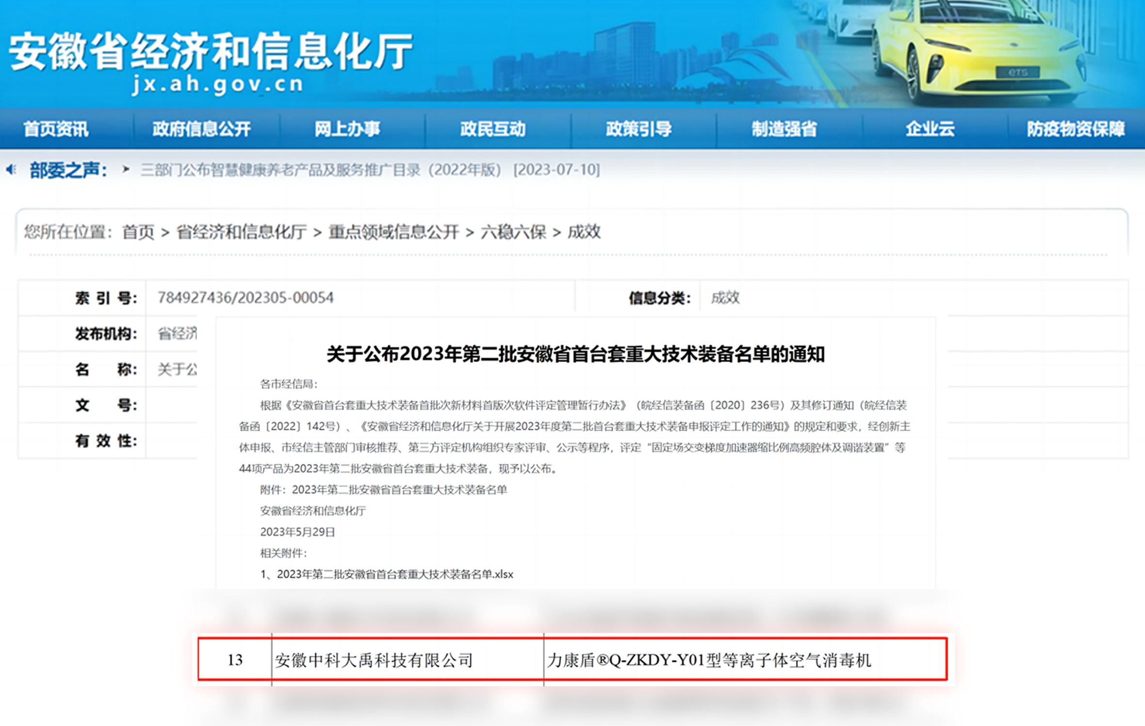 • 入選2023年第二批首臺套-力康盾?Q-ZKDY-Y01型等離子體空氣消毒機